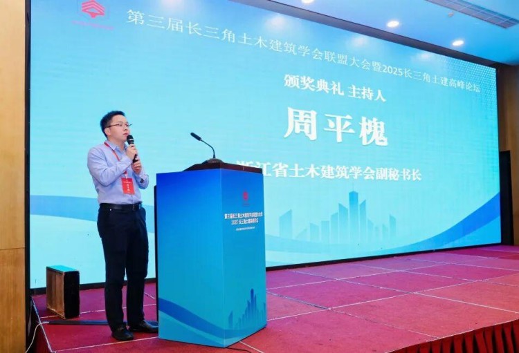 在下午主题报告开始前,大会举行隆重的颁奖典礼,由浙江省土木建筑学会副秘书长周平槐主持。现场揭晓并颁发了三大奖项。2025年长三角土木建筑科技创新成果一等奖5项,二等奖15项(颁奖嘉宾:蒋建良、叶国强);2025年长三角土木建筑杰出青年工程师20名(颁奖嘉宾:王华、冯卫);2025年度长三角土木建筑学会联盟最佳合作单位4家(颁奖嘉宾:褚共伟、应伯宣)。