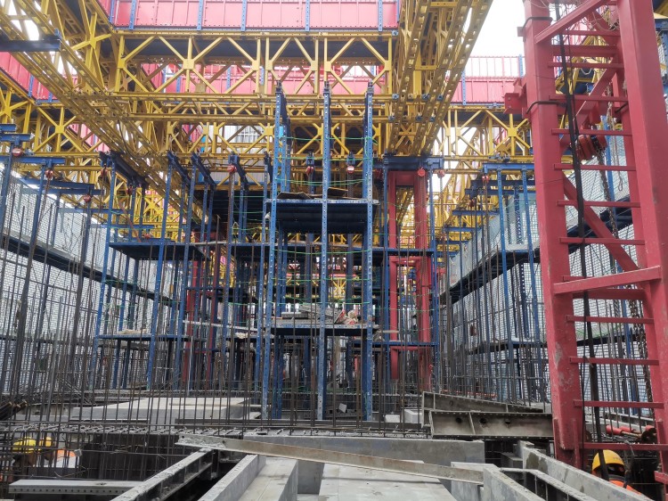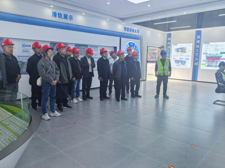 参会人员先后走进项目智慧展厅、智能试验室、轻量化智能造楼机作业面实地参观。在智慧展厅,项目团队详细演示了涵盖进度管控、安全预警、成本核算等模块的全流程智慧管理系统,展示了数字技术赋能项目全过程管理的实践成果;智能试验室内,全自动试件取样、检测、数据上传的全流程无人化作业模式,让参会人员直观感受到智能技术对工程质量管控效率的提升;在轻量化智能造楼机作业现场,工作人员就造楼机的结构设计、施工工艺、适配场景、降本增效成效等内容做了细致讲解。