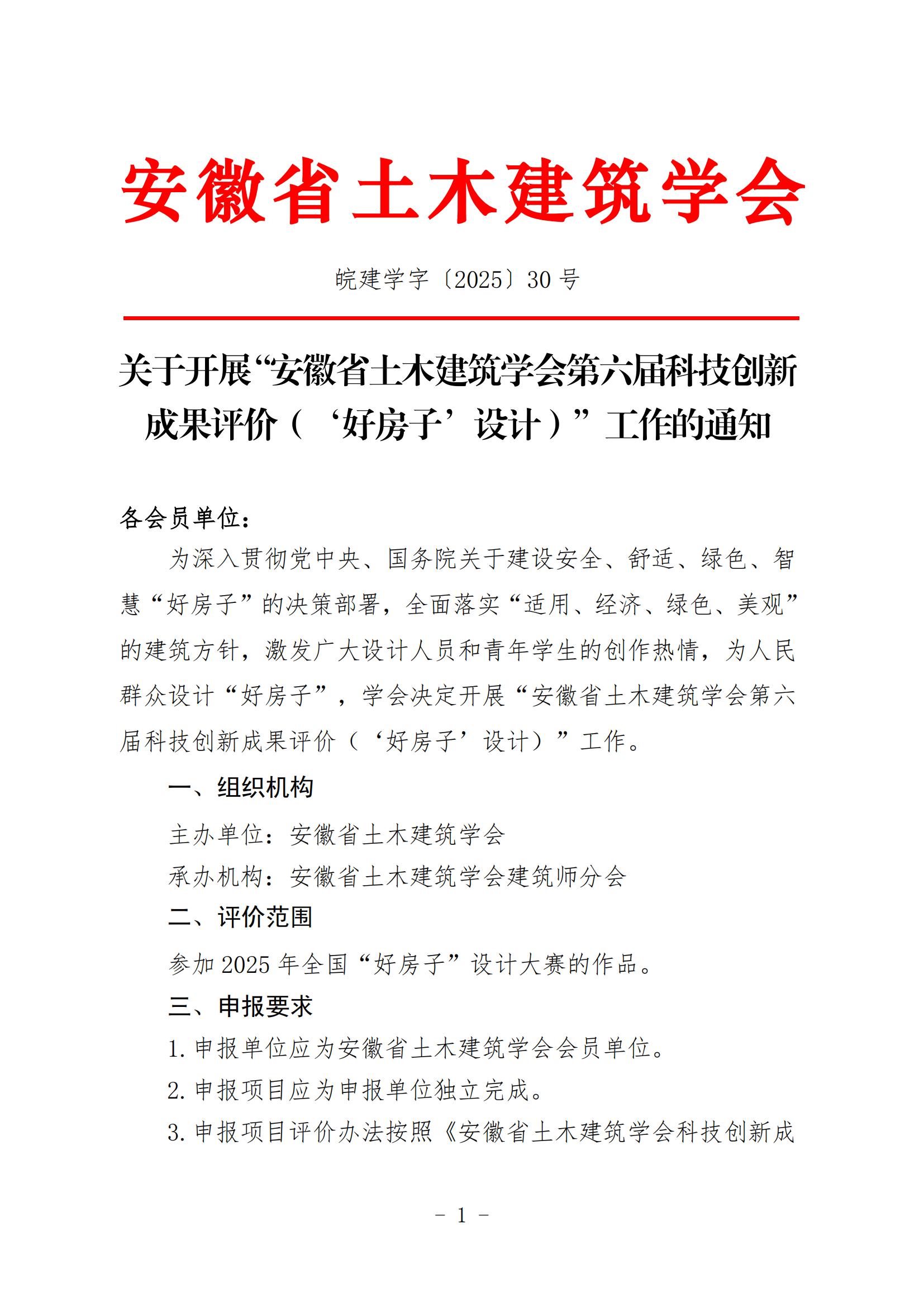 皖建学字〔2025〕30号 关于开展“安徽省土木建筑学会科技创新成果评价(‘好房子设计’)”工作的通知.pdf